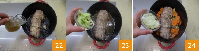 Pour in the broth you prepared 22 and the roughly chopped vegetables (23-34).