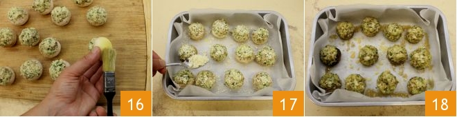 then brush them with the egg 16 and place them in a baking tray lined with parchment paper, with the filling facing upwards. Sprinkle with grated Parmesan cheese 17, drizzle with a little extra virgin olive oil and bake in a preheated static oven at 350°F for 20-25 minutes (if using a convection oven, at 320°F for 10-15 minutes). Once cooked 18 drizzle the stuffed champignon caps with a little olive oil and decorate the dish with a sprig of fresh parsley!