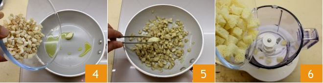 Then in a pan pour the oil and sauté the whole peeled garlic (you can also use it unpeeled). Once the garlic is golden, add the chopped mushroom stems 4 and let them brown for about 5 minutes. Remove the garlic 5 at the end of the cooking time. While the mushrooms are browning, place the bread crumbs in a blender 6 and blend them finely.