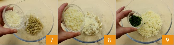 Once the mushrooms are cooked, transfer them to a bowl and add the chopped bread crumbs, the grated cheese keeping some aside for the gratin 7, the bread crumbs 8, and the chopped parsley 9.