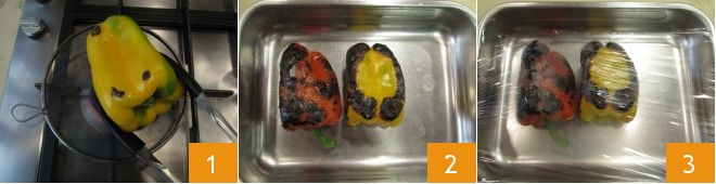 To make Neapolitan-style stuffed peppers, start by roasting the peppers over the stove flame using a flame spreader for at least 10 minutes each, turning them occasionally 1. If you don't have a flame spreader, you can roast the peppers in a very hot pan. Place the peppers in a baking dish 2, cover them with plastic wrap 3, and let them sit for at least 15 minutes before removing the skin.