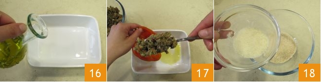 Now oil a baking dish 16, place the peppers inside, and stuff them with the filling you prepared earlier 17. In a bowl, mix the grated Parmesan with the breadcrumbs 18