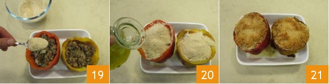 and sprinkle the mixture over the peppers 19, drizzle with olive oil 20, and flavor with freshly ground black pepper. Bake the peppers in a preheated static oven at 350°F for 35 minutes. Once cooked, they will be nicely golden on top 21. Let them cool slightly, then serve the Neapolitan-style stuffed peppers!