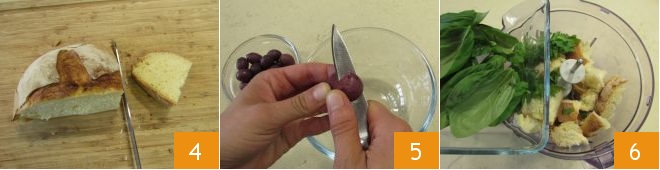 In the meantime, prepare the filling: slice the bread 4, cut it into cubes, and pit the Gaeta olives using a pitting tool or a knife 5. In the blender cup, place the bread, basil leaves, and parsley 6,