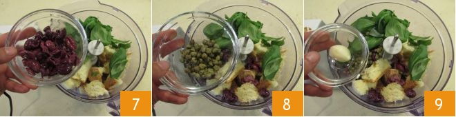 the Gaeta olives 7, and thoroughly desalinated capers 8. Add the whole peeled garlic clove 9