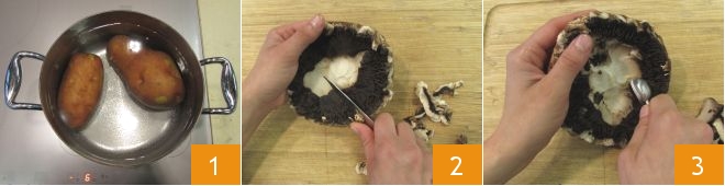 To prepare the stuffed portobello mushrooms, first put the potatoes in a saucepan with plenty of cold water 1 and boil them until you can easily pierce them with a fork. In the meantime, clean the mushrooms by trimming the edges of the caps with a knife to remove any damaged parts 2 and then gently hollow them out with a melon baller 3.