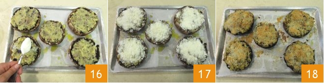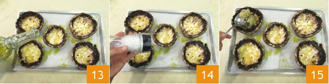 Place the mushroom caps on a baking sheet lined with parchment paper and drizzle them with a little oil 13 and a pinch of salt 14. Fill the mushrooms with the potato filling 15.