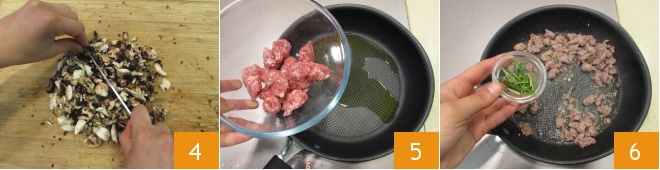 Chop the inside of the mushrooms 4 and set it aside along with the caps. Heat the oil in a pan, add the sausage paste 5 and brown it briefly, breaking it up with a wooden spoon, then add the rosemary 6.