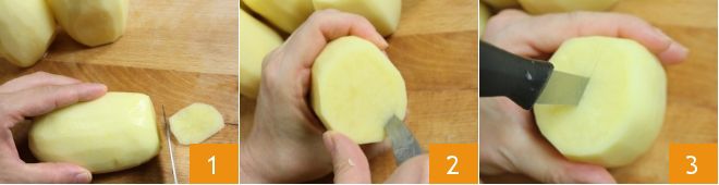 To prepare Grandma Franca's stuffed potatoes, start by peeling the potatoes. Then cut both ends 1, so that the potatoes stand upright on their own. Next, take a small knife, make a cut along the inner perimeter of the potatoes, leaving a 1/8-inch border 2, and make a cut in the center of the flesh 3 to facilitate extraction.