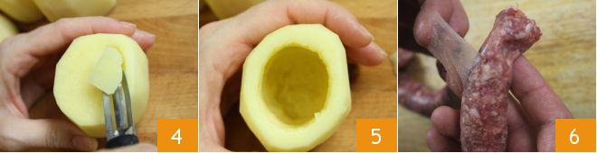 Still using a small knife, a melon baller, or a vegetable peeler, extract the inner flesh 4 without piercing the bottom 5. Once all the potatoes are scooped out, place them in a bowl and cover them with water; this way they won't turn brown. Now focus on preparing the ragù ingredients: make an incision in the sausage and crumble it into a small bowl 6.