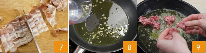 Then place the smoked bacon on a cutting board and cut it into strips and then into cubes 7. Peel a garlic clove and chop it finely, then pour extra virgin olive oil into a pan, and once hot, sauté the chopped garlic for a few minutes, then deglaze with water or vegetable broth 8. To find out how to prepare it best, consult our Cooking School: Vegetable broth. When the liquid has evaporated, add the crumbled sausage 9.