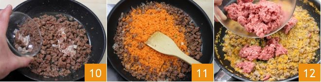 Continue by adding the cubed smoked bacon 10 and stir with a wooden spoon to crumble the meat well. Then add the chopped carrot and fresh scallion 11 and let cook over medium-high heat for 5 minutes. Afterward, pour a ladle of vegetable broth and also add the ground meat 12.