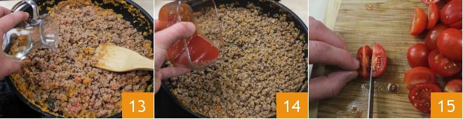 Stir to crumble the meat and deglaze with dry white wine. Pour a tablespoon of tomato paste into a small bowl and dissolve it with a bit of broth, then add it to the cooking ragù 14. Meanwhile, cut the cherry tomatoes into quarters 15.