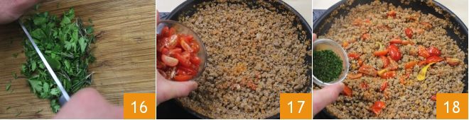 Finely chop marjoram, thyme, rosemary, and parsley 16, then add the quartered cherry tomatoes and the chopped aromatic herbs to the ragù (17-18).