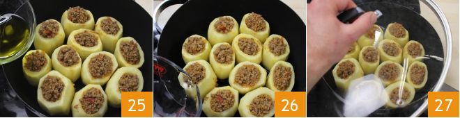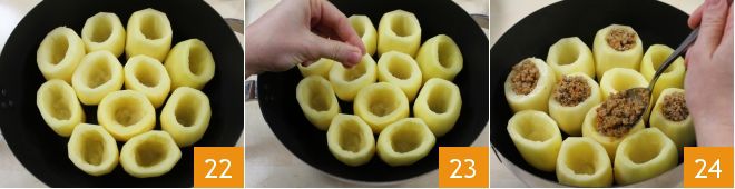 At this point, you can drain the potatoes, dry them with paper towels, and place them side by side in a wide pan, also suitable for oven cooking 22. Salt them inside one by one 23 and fill them with the ragù to the brim 34; 2-3 tablespoons per potato will be enough.