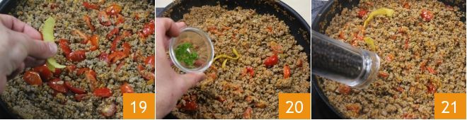 Add the zest of half a lemon 19 and the chopped green chili pepper with seeds removed 20. Salt and pepper to taste 21 and let the ragù cook for at least 30 minutes. When it has dried out, remove the lemon peels and adjust salt and pepper if necessary.