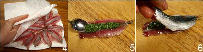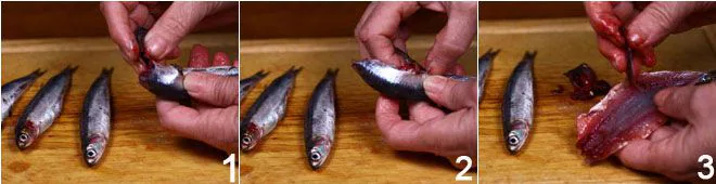 To start, you will need to How to Clean Anchovies. Remove the heads 1 and guts 2 of the sardines, then open them like a book and remove the central bone 3.