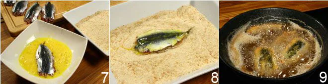 In a shallow plate, beat an egg with a fork and, in another, pour some breadcrumbs. Dip the "sardine sandwiches" in the beaten egg 7 and then in the breadcrumbs 8, then fry them in hot but not boiling oil 9 until they are golden on both sides. Once golden, place the fried sardines on some kitchen paper to drain, salt them, and serve them hot.