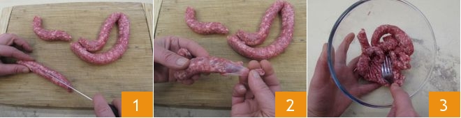 To prepare the stuffed turkey rolls with Champignon mushrooms, start with the sausage: cut it to more easily remove the casing (1-2), then work it in a bowl with a fork to crumble it 3