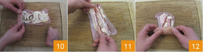 and also place a few slices of Champignon mushrooms 10. Complete with two slices of bacon 11; roll the roll up on itself 12