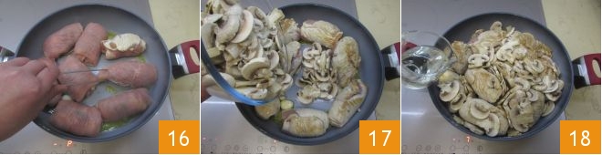 and let them brown, turning them to ensure even cooking 16. Add the 10.5 oz of mushrooms set aside to the pan 17, season with salt and pepper, and deglaze with the vegetable broth 18.