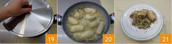Cover with a lid 19 and continue cooking for 15-20 minutes. Once cooked 20, turn off the heat and serve the stuffed turkey rolls with Champignon mushrooms hot 21!