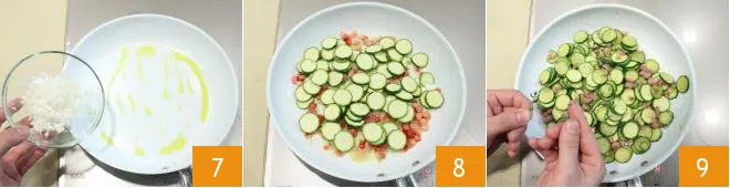Heat a drizzle of oil in a pan, add the scallion 7 and sauté over low heat for 5 minutes, then add the speck cubes and the zucchini rounds 8 and cook for another 8-10 minutes to soften the zucchini. Season with some fresh thyme leaves 9.
