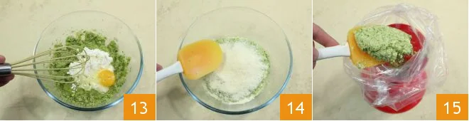 Mix with a whisk 13 to combine the ingredients. Finally, add the grated Grana Padano cheese 14, mix again, and then transfer the cream into a piping bag 15.