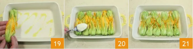 Fill the zucchini flowers with the mixture 16, placing a mozzarella stick in the center 17, then close the flowers well by twisting the tips 18.