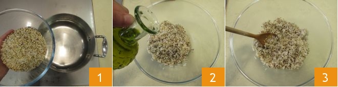 To prepare the stuffed zucchinis with grains and quinoa, first cook the mix in boiling, salted water to taste 1, for the time indicated on the package. Then drain it, transfer it to a bowl, and add a drizzle of oil 2. Mix 3 and let it cool in the refrigerator.