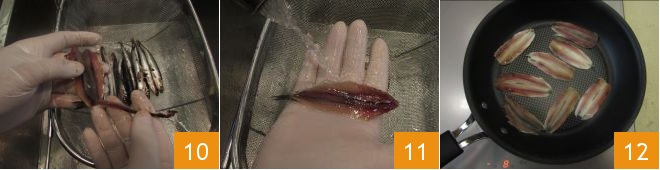 and by gently spreading them apart, also extract the central bone 10. Then let a pan heat up and place the anchovies inside 12.