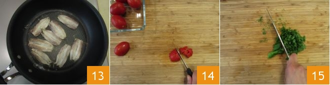 Cook them for about 4 minutes 13 then transfer them to a plate and let them cool. Then cut the cherry tomatoes into small cubes 14 and finely chop all the herbs together 15.