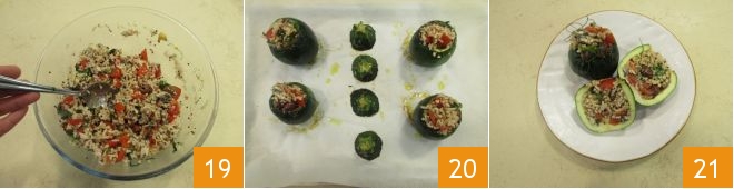 Mix everything 19 and use it to fill the zucchinis 20. At this point, you can serve them at room temperature 21 or keep them in the refrigerator until ready to enjoy.