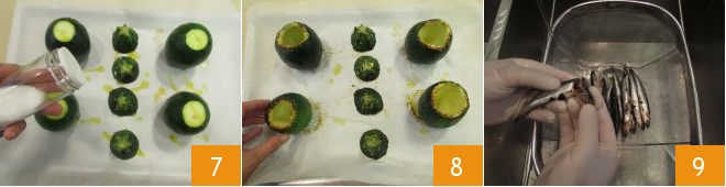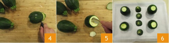 At this point, wash the zucchinis, then with a knife cut off the top cap, as if it were a sort of hat 4. Hollow out the zucchinis inside 5, to completely empty them. Finally, slightly score them at the base to straighten them. Place them upside down on a baking sheet lined with parchment paper 6;