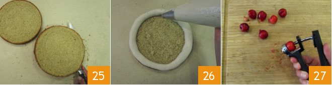 Then, using a long serrated knife, divide the sponge cake into 3 evenly thick discs 25. Fill the first disc with half of the soy milk diplomatic cream 26. Wash and pit the cherries 27, then cut them in half.