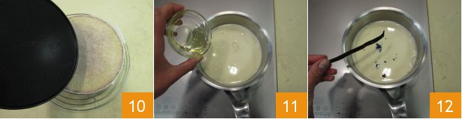 Without burning yourself, immediately turn it over onto a wire rack and let it cool completely 10. In the meantime, prepare the cream. In a saucepan, pour the soy milk, honey, the seeds scraped from the pod, and the pod itself 12. Gently bring to a boil.