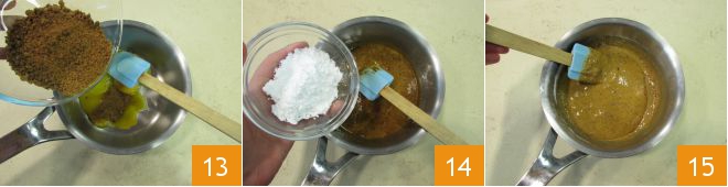 Meanwhile, in another pot, pour the egg yolks and sugar 13. Stir with a spatula, add the cornstarch 14, and stir again until you obtain a smooth consistency 15.