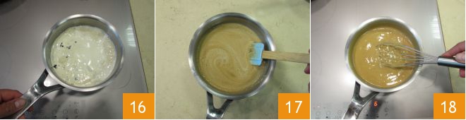 When the milk starts to boil 16, pour a small part of it into the pot with the yolks. Stir to temper the mixture, then add the remaining part, stir again 17, and bring everything back to the heat. Continue stirring with a whisk until the cream thickens.
