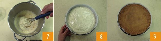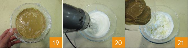 Mix with a whisk from bottom to top 22 until you obtain a homogeneous consistency. Transfer into a piping bag with a plain nozzle and place in the fridge 23. At this point, take the sponge cake. Remove it from the mold and gently remove the parchment paper 34.