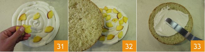 Place the remaining chantilly cream on the second layer of sponge cake and add the peach slices on top 31. Cover with the last layer of sponge cake 32 and cream 33.