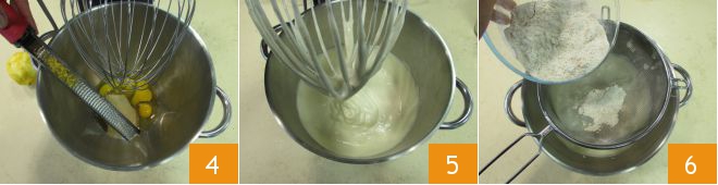 Also add the lemon zest, taking only the yellow part 4, and run the machine at medium speed for about 15 minutes. You should obtain a fluffy, light, and frothy mixture 5. Turn off the machine and sift the whole wheat flour directly into the mixture 6.