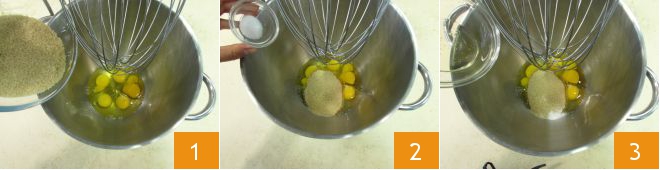 To prepare the summer cake with whole wheat sponge cake, first make the base. Pour the eggs into the bowl of a stand mixer fitted with a whisk. Add the brown sugar 1, salt 2, and honey 2.