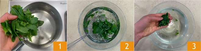To prepare the summer couscous with marinated anchovies and primosale, start with the mint-flavored oil: blanch the mint leaves for a few seconds in boiling water 1, then drain in ice water 2. When it is well chilled, squeeze the mint 3 and transfer it to a jar.