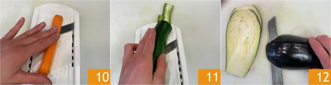Move on to the vegetables: trim and peel the carrots, then slice them thinly with a mandoline 10. Trim the zucchini and do the same 11, then slice the eggplants thinly with a knife 12.