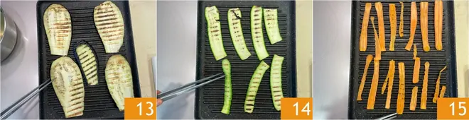 Heat a grill well and grill the eggplant slices 13, zucchini 14, and carrot 15 on both sides. Set aside and let them cool slightly.