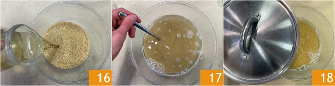 In the meantime, focus on the couscous: bring the water to a boil, salt it, and pour it into a bowl where you have placed the couscous 16. Stir 17 and cover with a lid 18.
