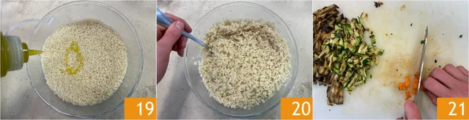 After a few minutes, the couscous will have absorbed all the water, so season with a drizzle of oil 19 and fluff the grains well with a fork 20. Let it cool slightly and meanwhile cut the grilled vegetables into strips 21.