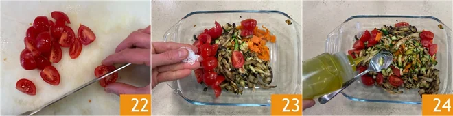 Also divide the cherry tomatoes into quarters 22. Combine the vegetables in a bowl and season with salt 23 and oil 34.