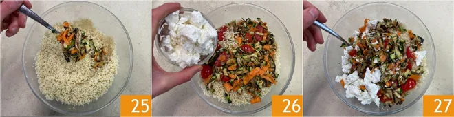 Now add the vegetable mix to the couscous 25, then add the primosale broken into pieces with your hands 26 and mix everything well 27.