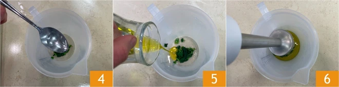 Add a couple of tablespoons of iced water 4 and the oil 5, then blend with an immersion blender 6.